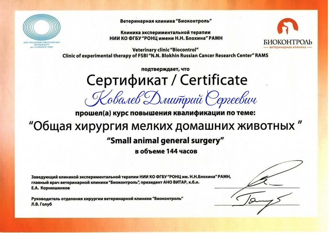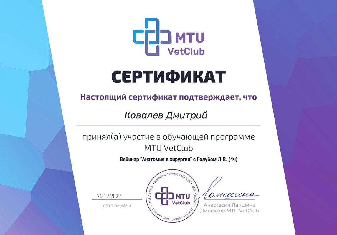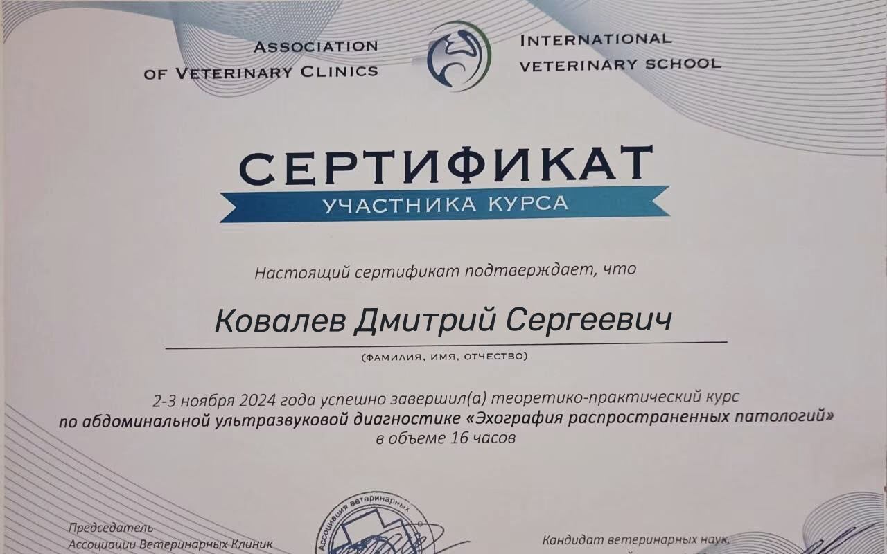 Дмитрий Сергеевич — ведущий хирург, травматолог и ортопед с ученой степенью кандидата ветеринарных наук. Как заведующий хирургическим отделением, он берется за самые сложные случаи, включая передовые операции на суставах (TPLO, TTA) и остеосинтез.