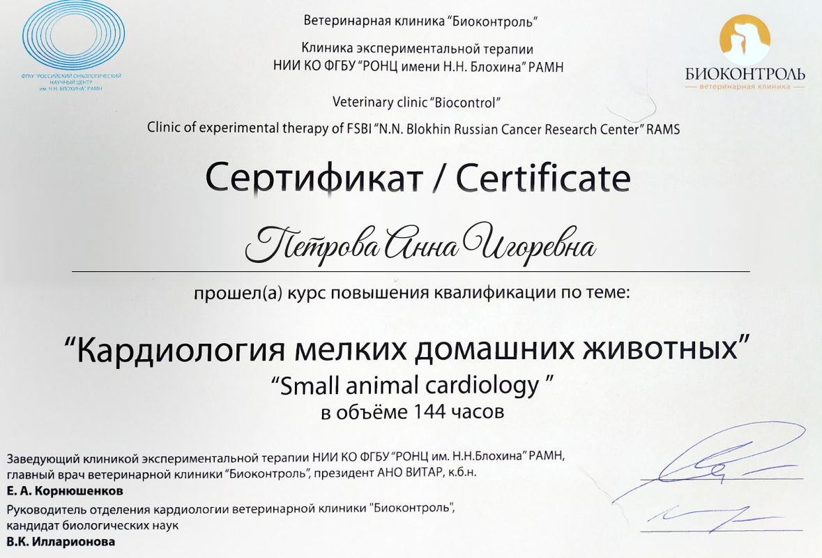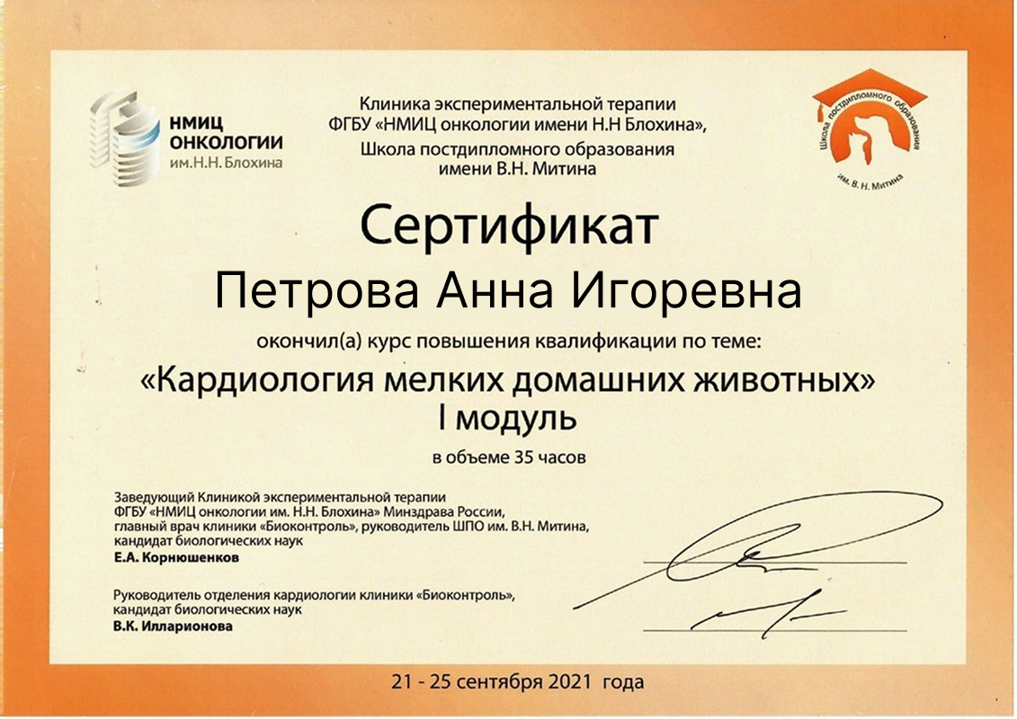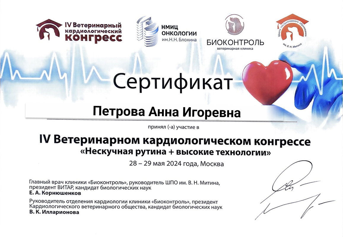 Анна Игоревна глубоко убеждена, что своевременное обнаружение проблем с сердцем может подарить годы счастливой жизни. Работая с пожилыми животными и породами, предрасположенными к кардиологическим проблемам, она составляет подробный, индивидуальный план поддержки, обеспечивая комфорт и стабильность состояния пациента.